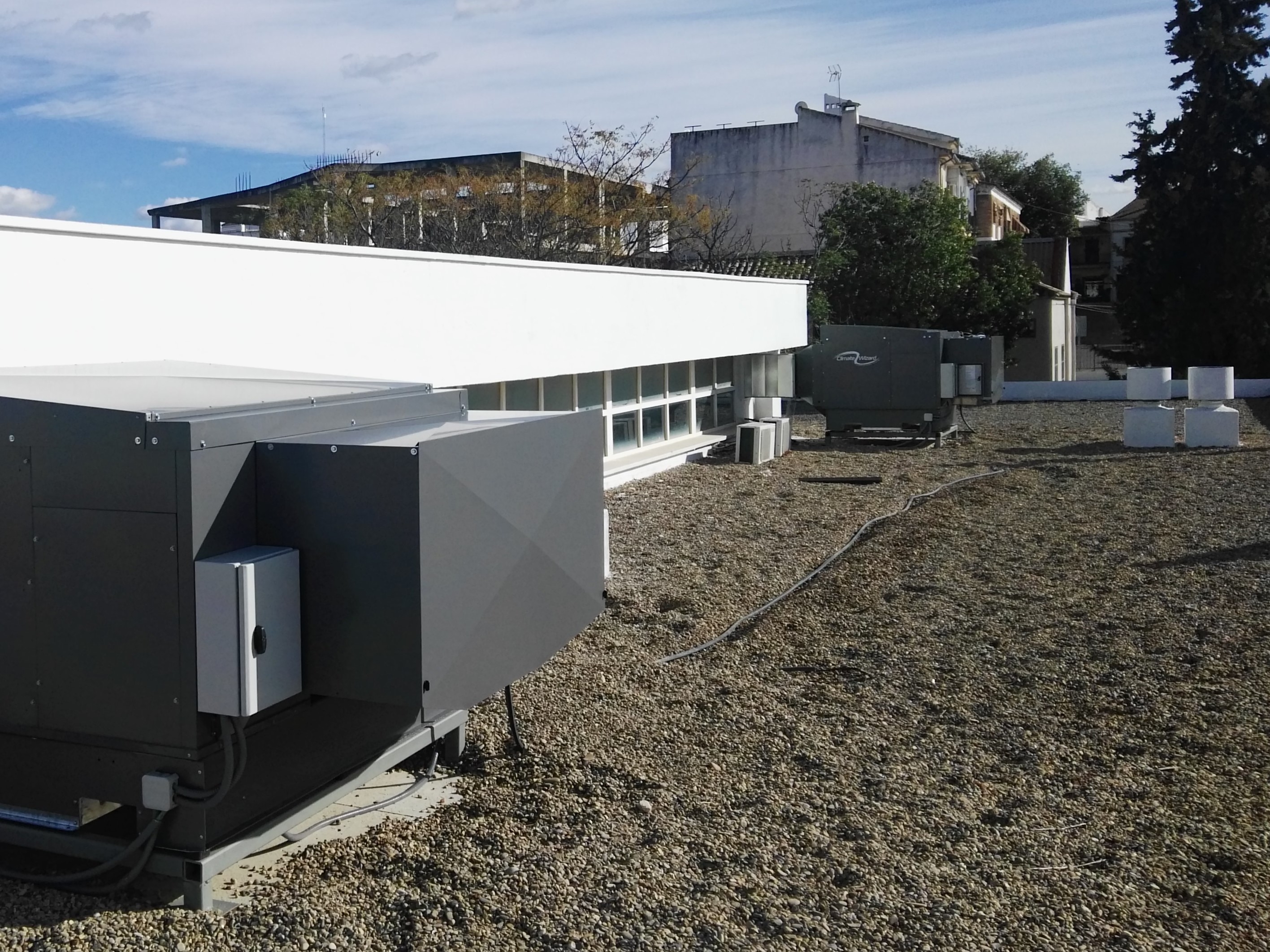 La refrigeración adiabática es un sistema de climatización alternativo al aire acondicionado convencional que funciona bajando la temperatura del aire interior mediante la evaporación del agua. Sus principales ventajas son el bajo consumo eléctrico (hasta un 80% inferior al del aire acondicionado) y las menores emisiones de CO2. Asimismo, funciona con las ventanas abiertas y utiliza siempre aire fresco, sin recirculación, mejorando así la calidad del aire interior. En cuanto a la instalación de placas fotovoltaicas, además de reducir el gasto en consumo eléctrico en los centros, evita también emisiones de CO2 a la atmósfera.