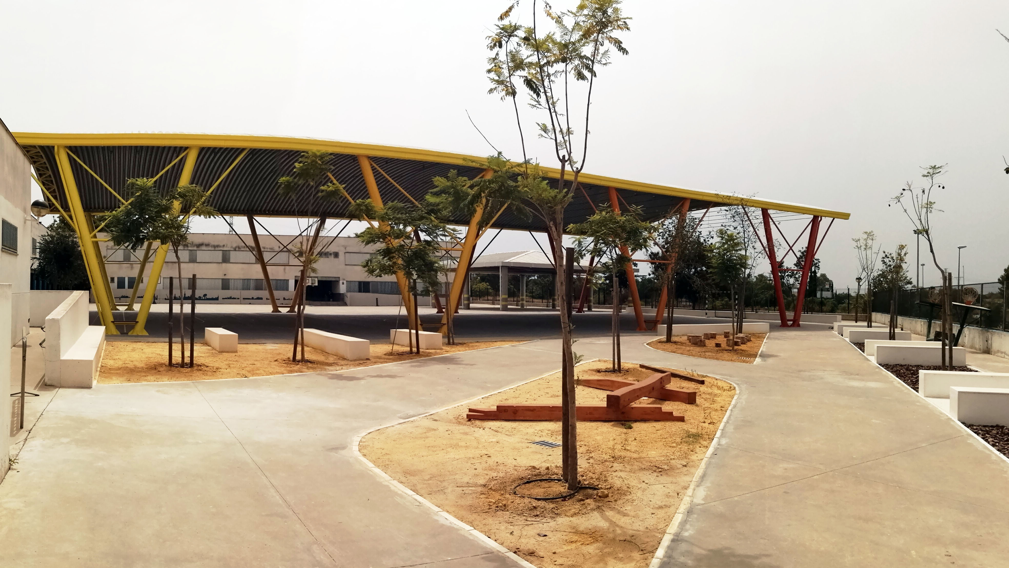 La intervención finalizada ha consistido en la creación de zonas de sombra, la sustitución de pavimentos y el incremento de la vegetación. La dotación de sombras se ha realizado en el área deportiva, donde se ha cubierto una de las pistas existentes. Además, se ha sustituido el pavimento de hormigón por otro con mejores condiciones térmicas y, finalmente, se ha incrementado la vegetación en las zonas ajardinadas y se han colocado árboles en áreas estratégicas del recinto.